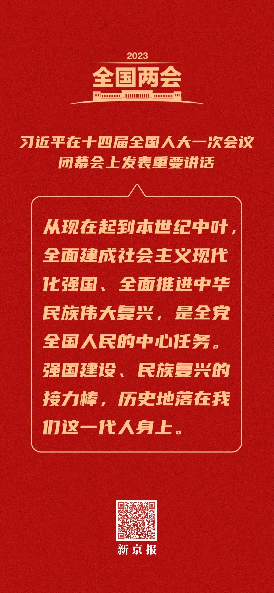 习近平说,从现在起到本世纪中叶,全面建成社会主义现代化强国、全面推进中华民族伟大复兴,是全党全国人民的中心任务。强国建设、民族复兴的接力棒,历史地落在我们这一代人身上。我们要按照党的二十大的战略部署,坚持统筹推进“五位一体”总体布局、协调推进“四个全面”战略布局,加快推进中国式现代化建设,团结奋斗,开拓创新,在新征程上作出无负时代、无负历史、无负人民的业绩,为推进强国建设、民族复兴作出我们这一代人的应有贡献!