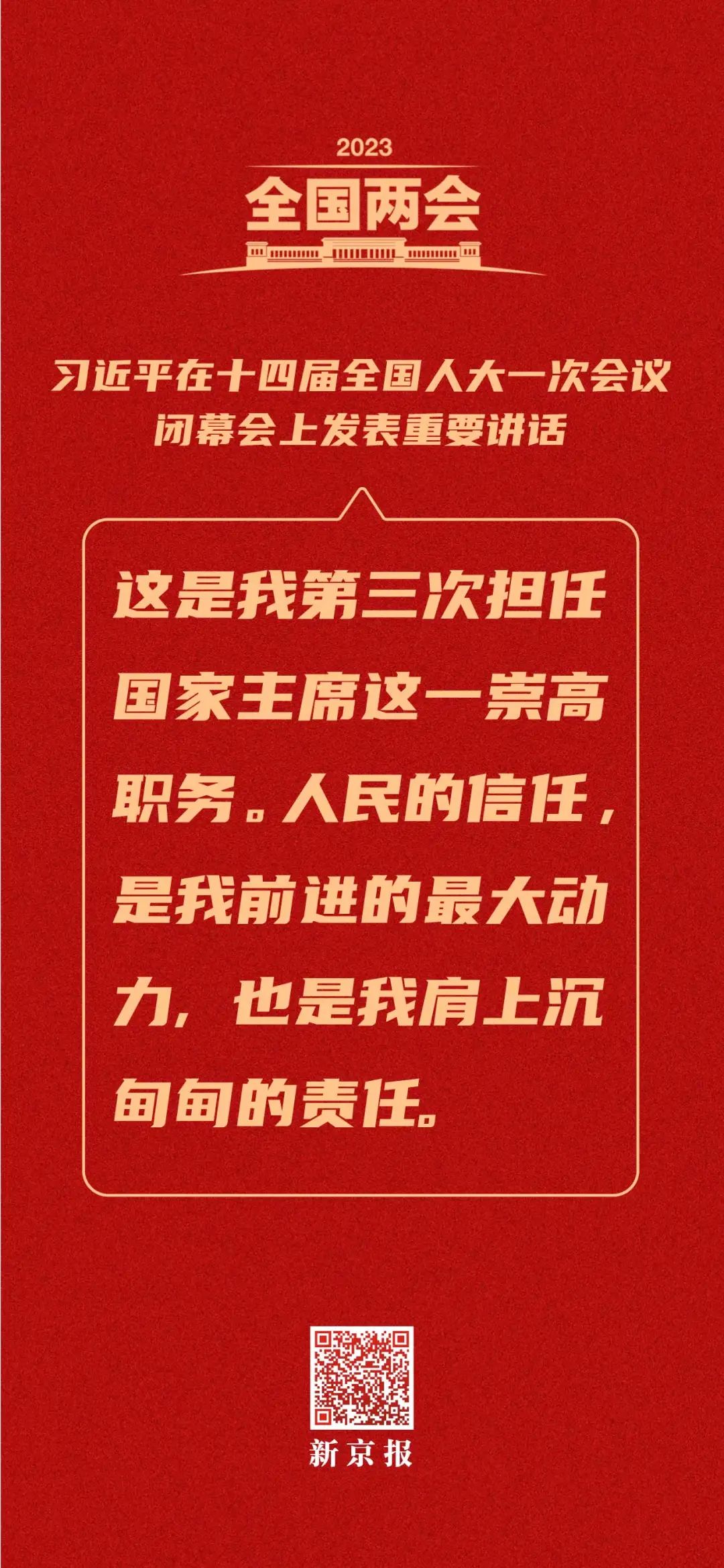 习近平说,这是我第三次担任国家主席这一崇高职务。人民的信任,是我前进的最大动力,也是我肩上沉甸甸的责任。我将忠实履行宪法赋予的职责,以国家需要为使命,以人民利益为准绳,恪尽职守,竭诚奉献,绝不辜负各位代表和全国各族人民的重托!