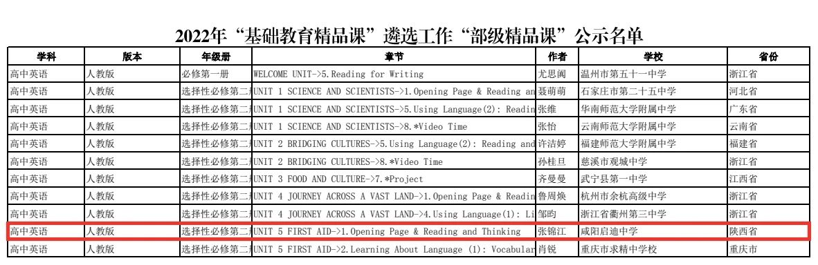 根据教育部办公厅《关于开展2022年“基础教育精品课”遴选工作的通知》(教基厅〔2022〕20号)文件安排,经各级专家遴选,我校英语师范学院·教育学院2018级校友张锦江的高中英语课例最终被评为“部级精品课”。