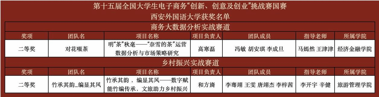 近日,第十五届全国大学生电子商务“创新、创意及创业”挑战赛全国总决赛圆满收官(简称“三创赛”)。经过激烈角逐,我校参赛代表队荣获商务大数据分析实战赛道全国二等奖1项,乡村振兴赛道全国二等奖1项。