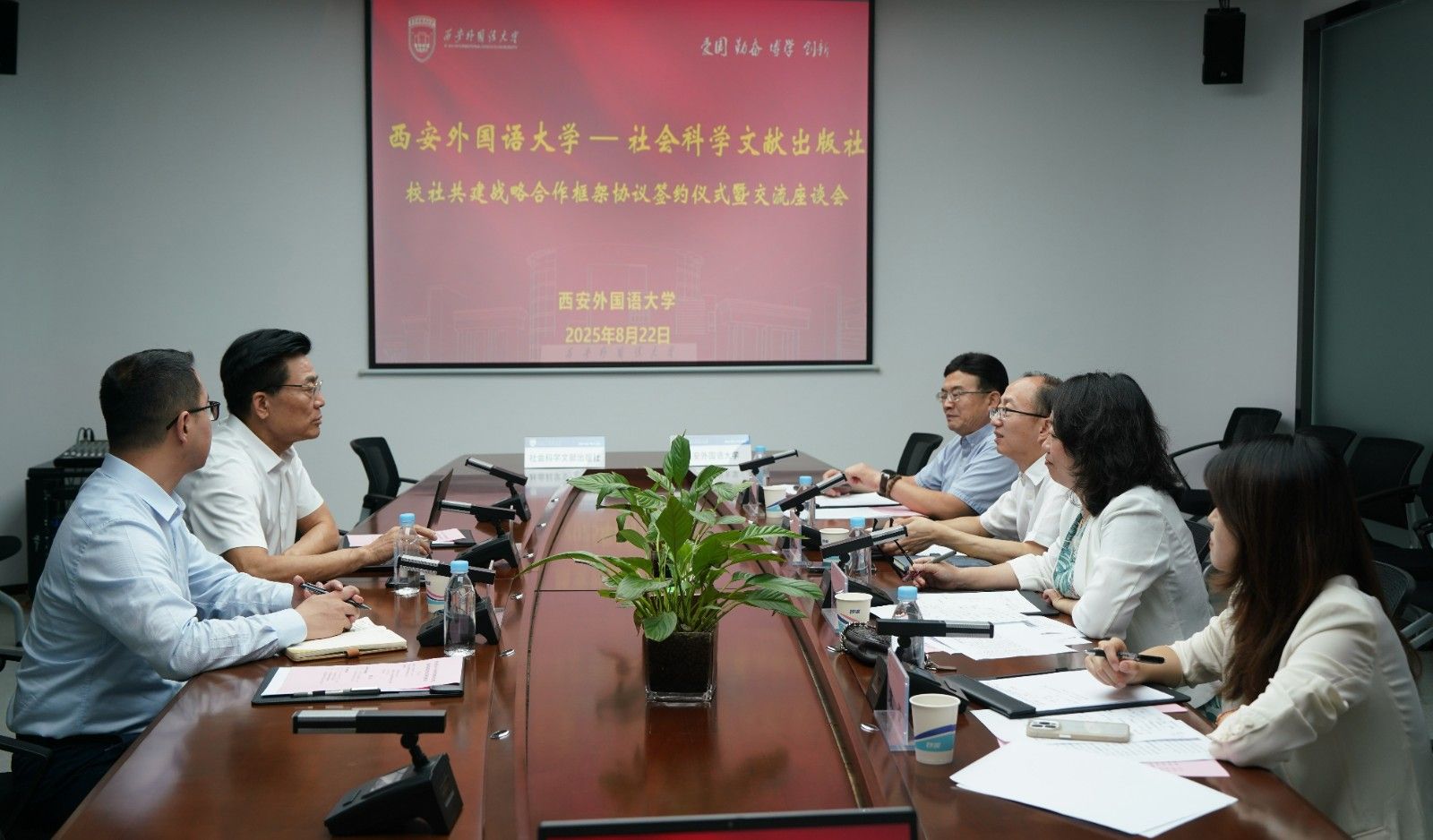 2025年8月22日上午,社会科学文献出版社党委书记、社长冀祥德,行政部副主任李杰等一行到访我校雁塔校区并进行交流座谈。学校党委委员、副校长黄立波出席会议,科研处相关人员陪同参加。
