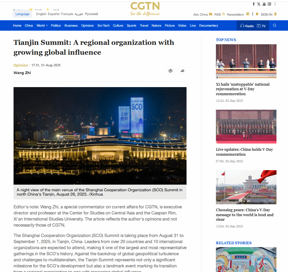 近日,我校中亚·环里海研究中心首席专家王志教授应中国国际电视台(CGTN)特邀,就2025年上海合作组织天津峰会撰写的英文专题评论《Tianjin Summit: A regional organization with growing global influence》正式刊发。文章深入解析了上合组织从区域性机制向全球性多边平台转型的战略意义,引发学术界广泛关注。