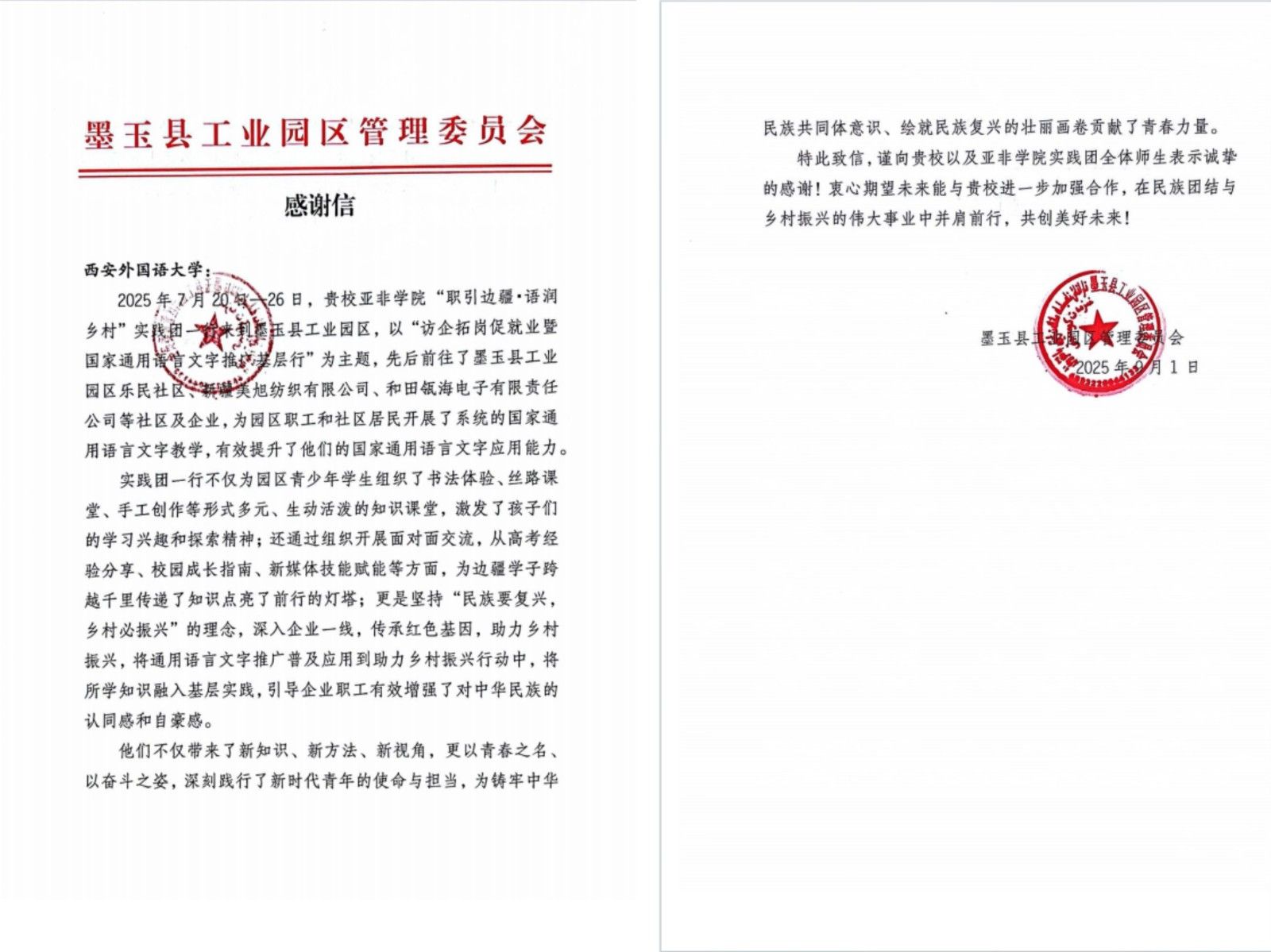 近日,我校亚非学院收到新疆墨玉县工业园区管理委员会感谢信,肯定亚非学院“职引边疆・语润乡村”实践团暑期“三下乡”工作,彰显高校在乡村振兴与民族团结中的使命担当。
