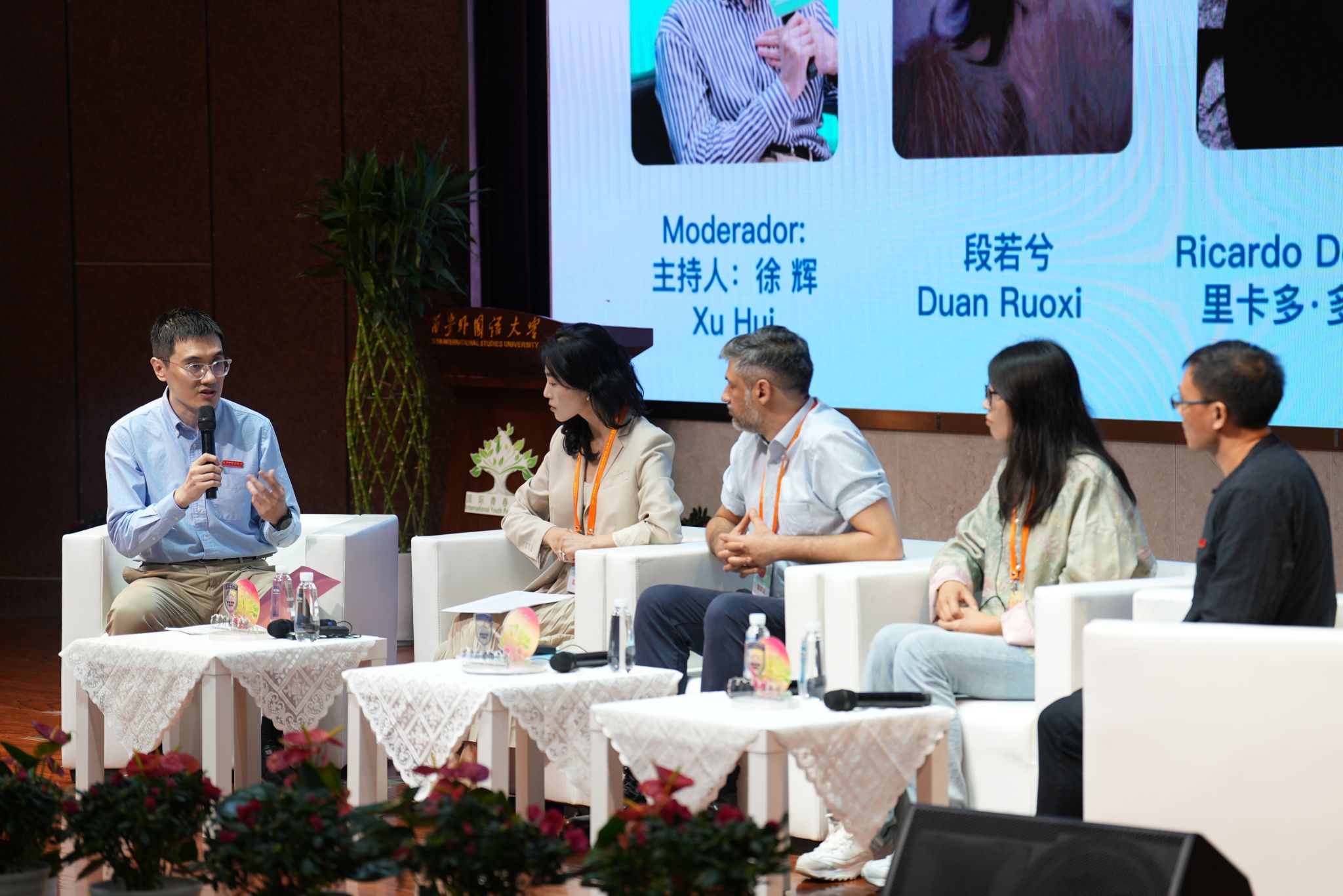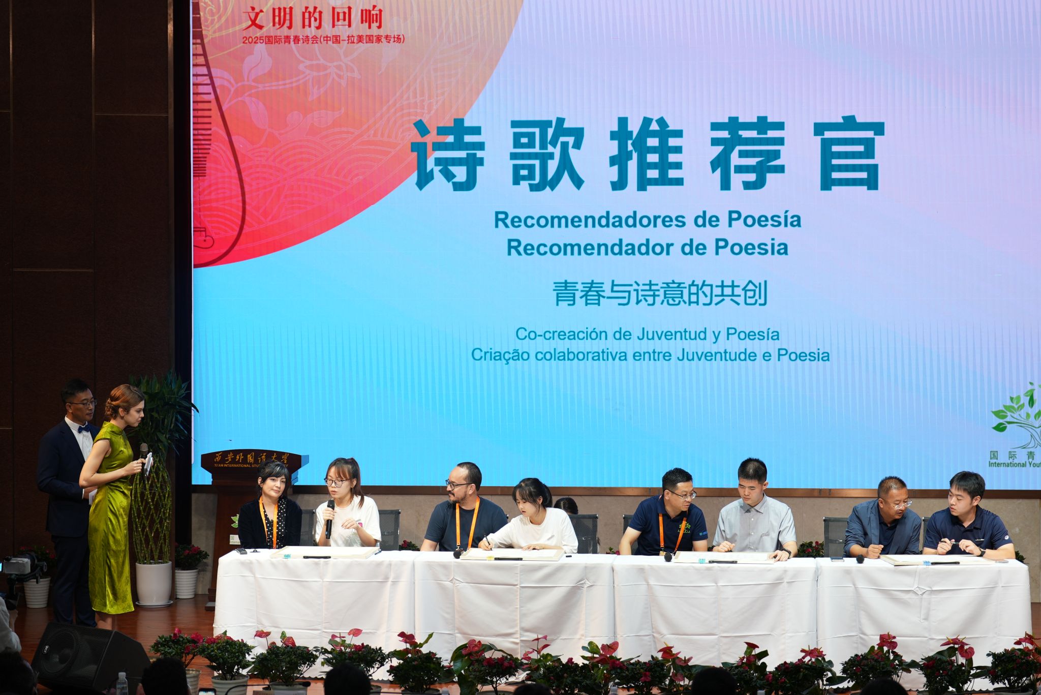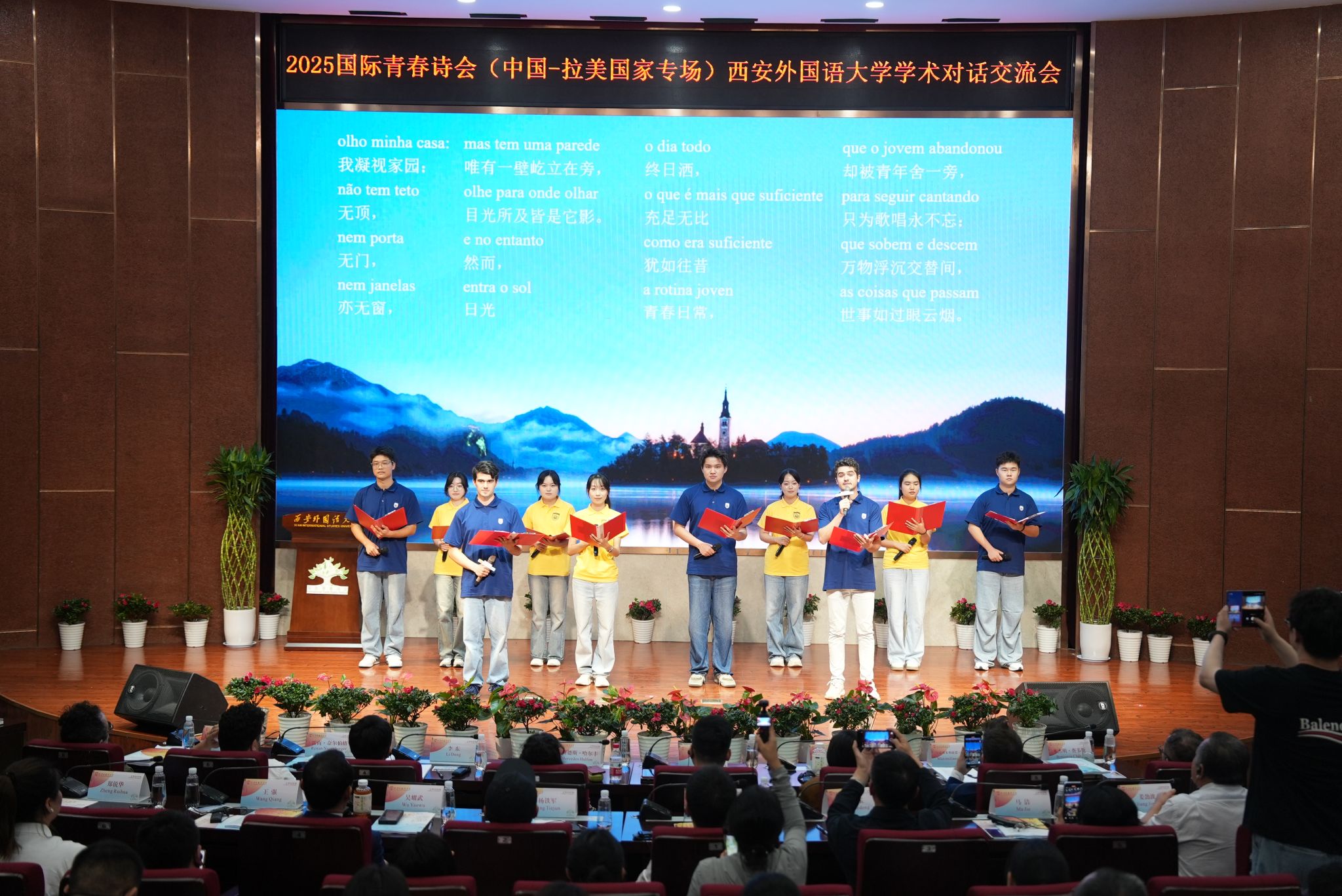 外籍嘉宾分别与学生合作创作中文、西语和葡语主题诗歌,随后诗人们结合自身经历,分享对青春与诗歌的感悟,抒发真实的“我的青春记忆”。我校学子代表用多语种朗诵《青春的同题诗》,围绕青春抒发日常、往昔、成长等多重感悟。我校领导向嘉宾们赠送了一份充满心意的礼物——由我校制作的月饼与印有诗句的有声相框,以此表达诚挚的祝福。