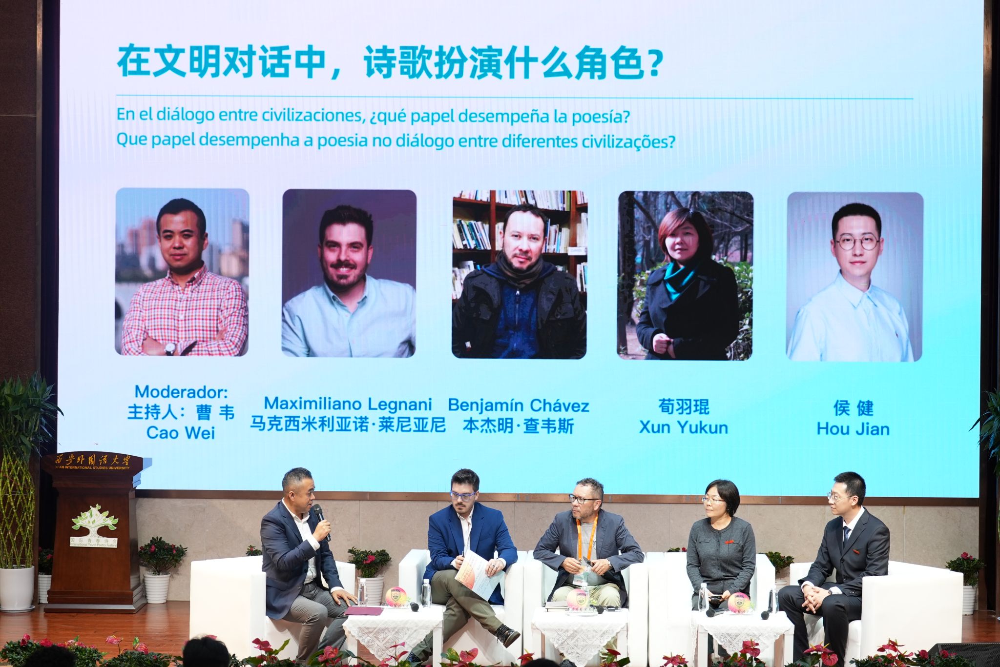 9月16日,由中国作家协会、中共陕西省委宣传部主办的“2025国际青春诗会(中国-拉美国家专场)”学术对话交流会在我校顺利落幕。本次活动由来自阿根廷、玻利维亚、巴西等国家的10位拉美诗人、来自中国的14位诗人及我校多位研究中外文化的专家教授共同参加。中国作协对外联络部副主任郑磊,陕西省作家协会党组成员、社联部主任蔺晓东,军人学者杨铁军,我校校长吴耀武,党委副书记马洁、王强,纪委书记姜劲波,党委委员郑锐华出席,中文学院、欧洲学院、汉学院、国际关系学院、国际处、学工部、团委等相关单位师生代表参加活动。