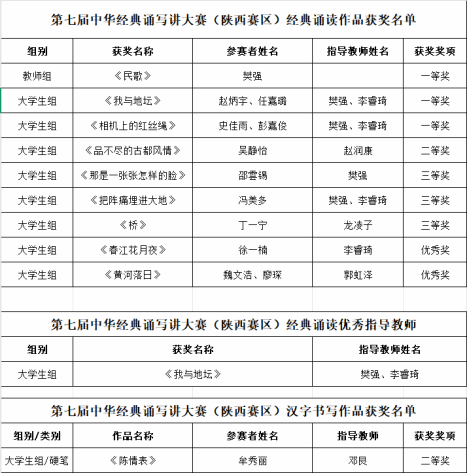 近日,陕西省教育厅公布了第七届中华经典诵写讲大赛(陕西赛区)比赛结果,我校师生取得佳绩,获“诵读中国”经典诵读大赛教师组一等奖1项,大学生组一等奖2项、二等奖1项、三等奖3项、优秀奖2项,优秀指导教师2名。