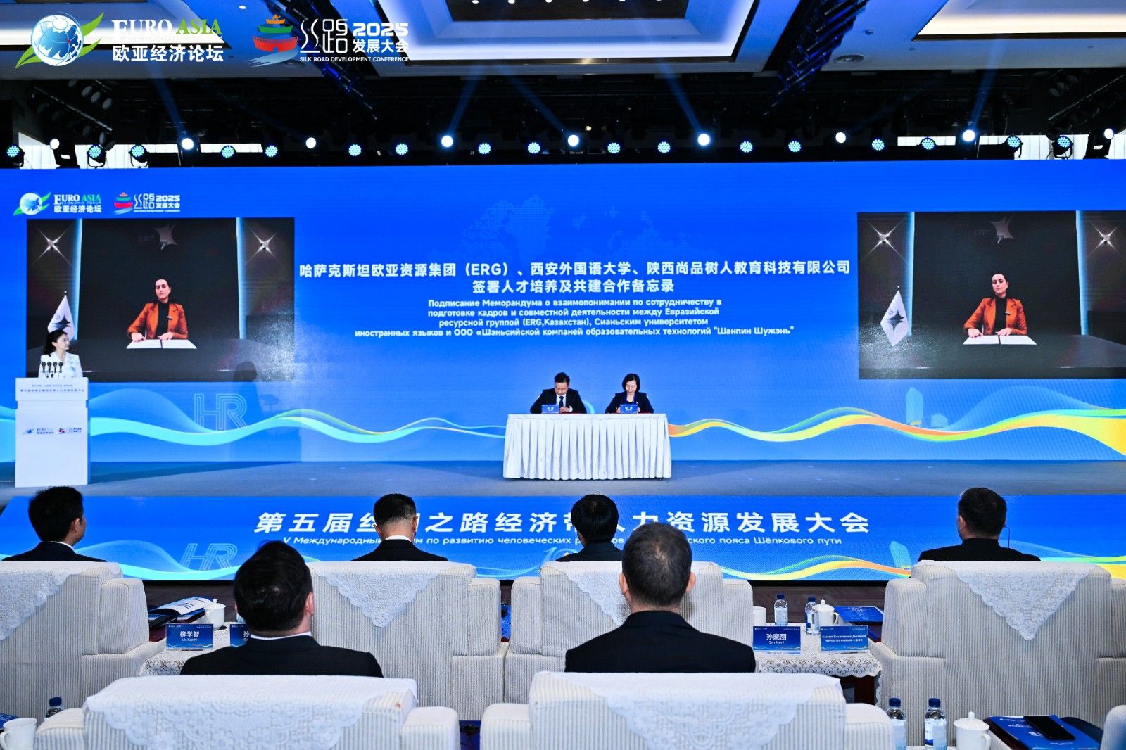 我校副校长邓滢应邀出席,并在签约环节代表学校与哈萨克斯坦欧亚资源集团(ERG)及陕西尚品树人教育科技有限公司共同签署了人才培养及共建合作备忘录。该合作将有力推动校企协同育人,深化国际人力资源合作,为丝绸之路经济带沿线地区的人力资源协同发展注入新的活力。