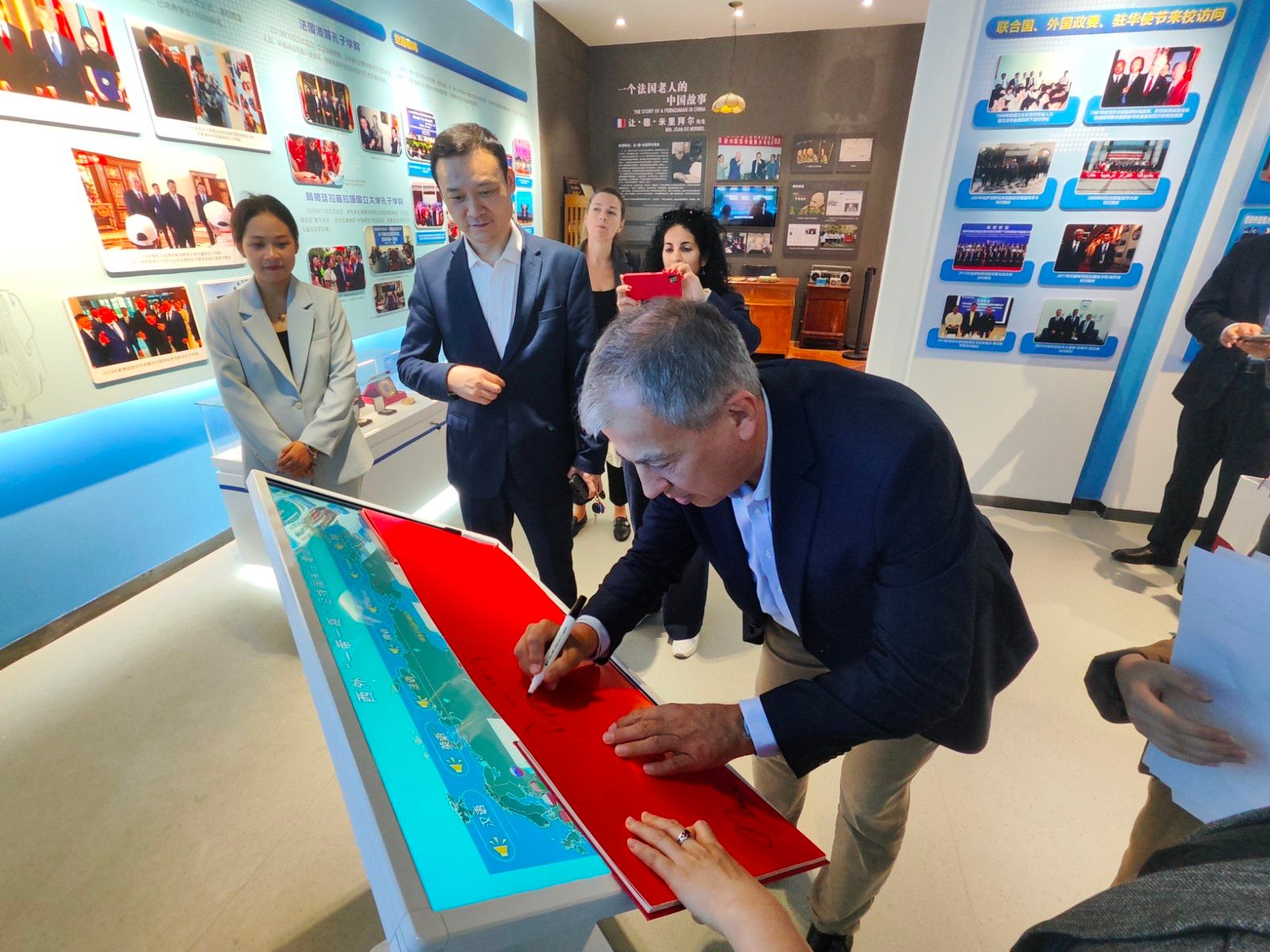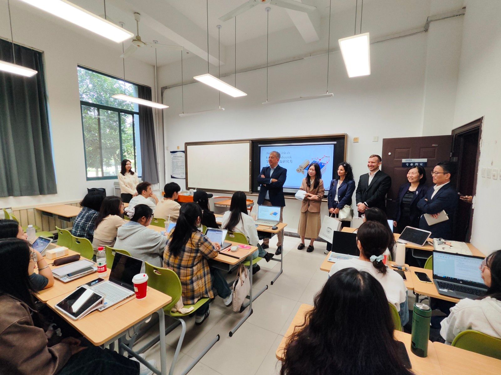 会谈结束后,代表团在校领导陪同下参观了校史馆,认真听取馆藏文献讲解,并在国际交流展区留下珍贵题词。随后,代表团走进匈牙利语专业大四年级《学术写作与研究方法》课堂观摩教学。欧拉·劳约什与师生亲切交流,勉励同学们扎实语言基础,努力成为联通中匈文化的桥梁之才。