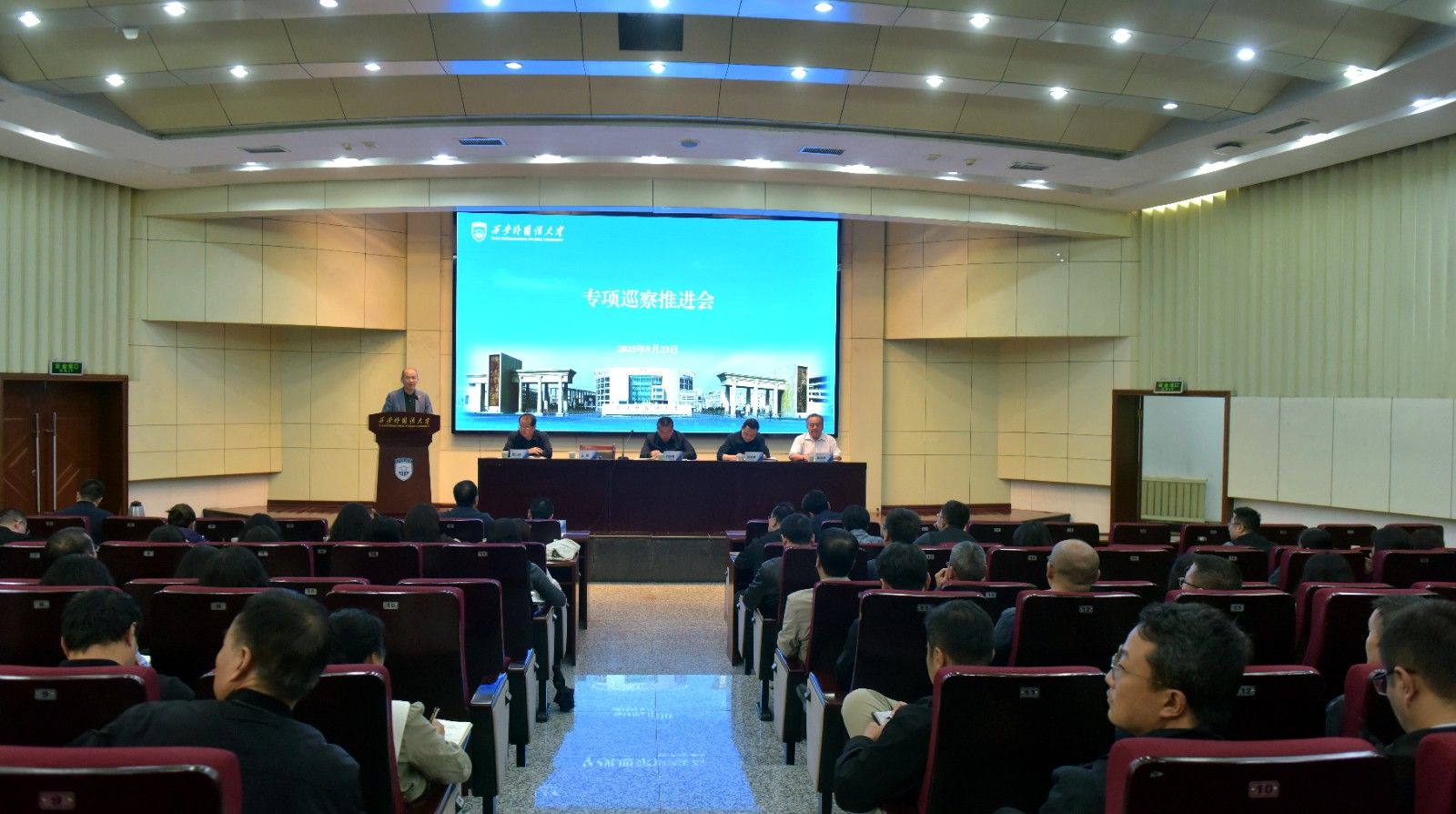 9月23日下午,学校在校务楼一层报告厅召开2025年专项巡察推进会。党委书记刘振涛,校长吴耀武,党委副书记王强,党委副书记、纪委书记姜劲波,副校长桑元峰等校领导出席。各职能处室处级干部、各二级单位党政负责人,被巡察单位处科级干部及巡察组全体成员参会。会议由党委副书记王强主持。
