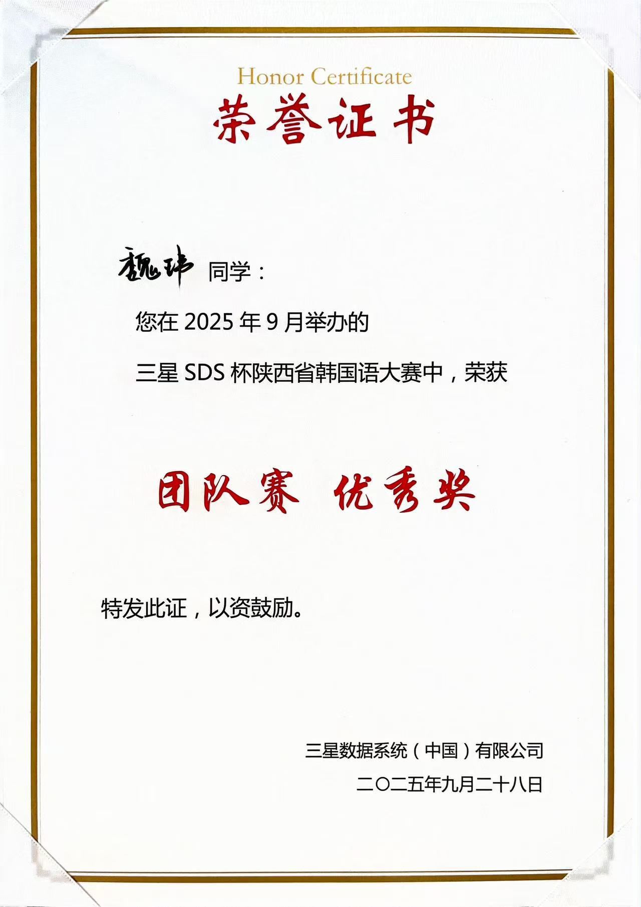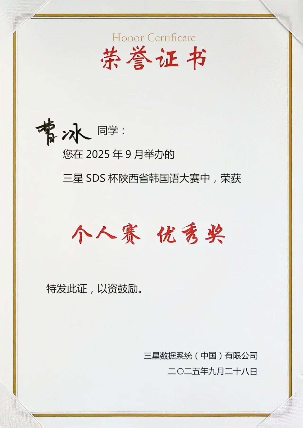 在2025年9月28日落幕的“韩韵秦风·语你同行”“三星SDS杯”陕西省大学生韩国语大赛中,我校韩国语专业6名学生凭借扎实的语言功底和出色的现场发挥,从全省5所高校的数十名选手中脱颖而出,斩获多项荣誉。同时,1名教师凭借卓越的指导能力荣获“最佳导师奖”。