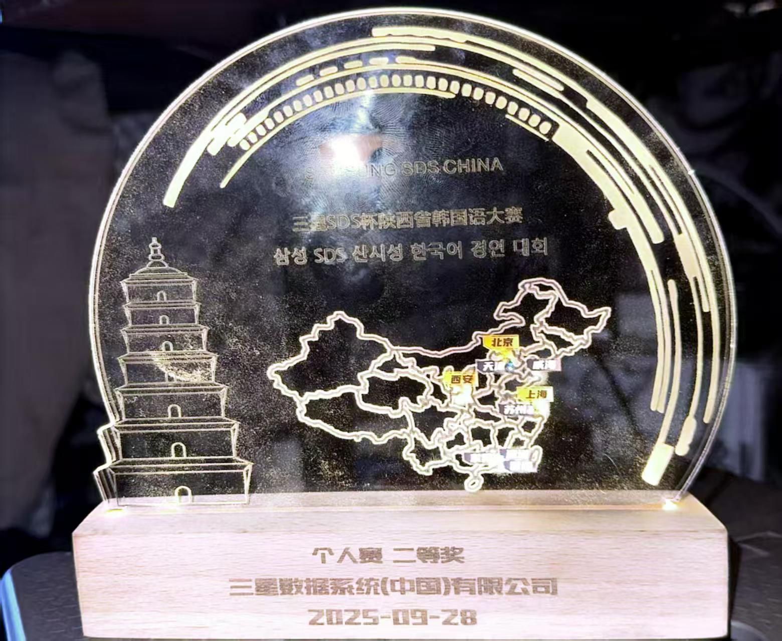 本次大赛由三星数据系统(中国)有限公司主办,大赛评委由韩国驻西安总领事馆领事、三星数据(中国)总裁、三星数据西安分公司总经理和陕西高校韩国语专业知名教授组成。大赛分为个人赛与团体赛两个单元。在个人赛中,我校亚非学院韩国语专业2022级陈汐以《我和韩国语的那些故事》为题,凭借流畅的表达与真挚的情感赢得评委一致好评,荣获一等奖,并获得5000元奖金及三星平板电脑一台;同年级屈坤以《AI时代语言专业的新启发》展开论述,观点新颖、逻辑清晰,斩获二等奖,收获2000元奖金及三星手表一只。2022级曹冰、2024级张书阁亦表现突出,获个人优秀奖。在团体赛中,由2022级魏玮、卢星宇组成的团队通过精彩生动的配音剧演绎,赢得“团队优秀奖”。此外,吴海利老师获得个人赛“最佳导师奖”。