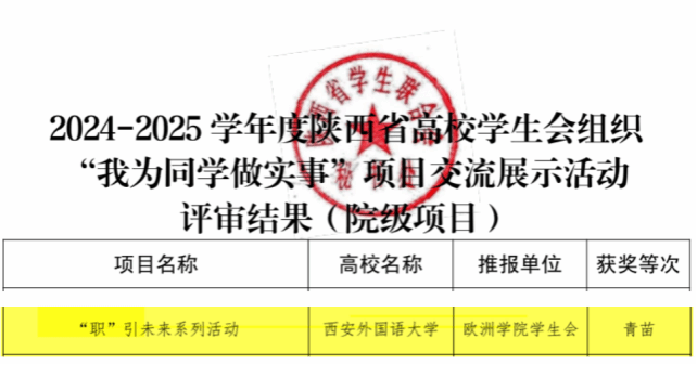 本次活动共有全省47所高校、110个项目参与,经学校申报、专家评审、答辩路演等环节,共评选出陕西省高校学生会组织“我为同学做实事”精品项目22个、优秀项目28个、青苗项目48个。欧洲学院学生会组织将以本次活动为契机,持续关注并着力破解同学们关心的职业规划难题,进一步塑造阳光奋进的组织形象,不断巩固既有成果、拓展新的工作领域,切实提升学生会组织的同学信赖度、学校认同感和社会影响力,以更扎实的服务书写青年成长与校园发展的双向奔赴新篇章。