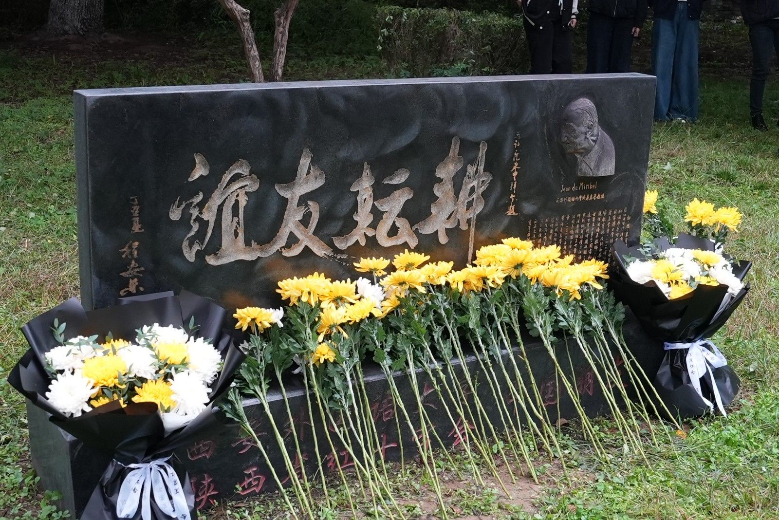 缅怀仪式在苍松翠柏环绕的让·德·米里拜尔纪念碑前庄严举行。欧洲学院法语专业学生以一首深沉优美的法语诗朗诵《大地与星辰》,表达了对先生无限的追思。