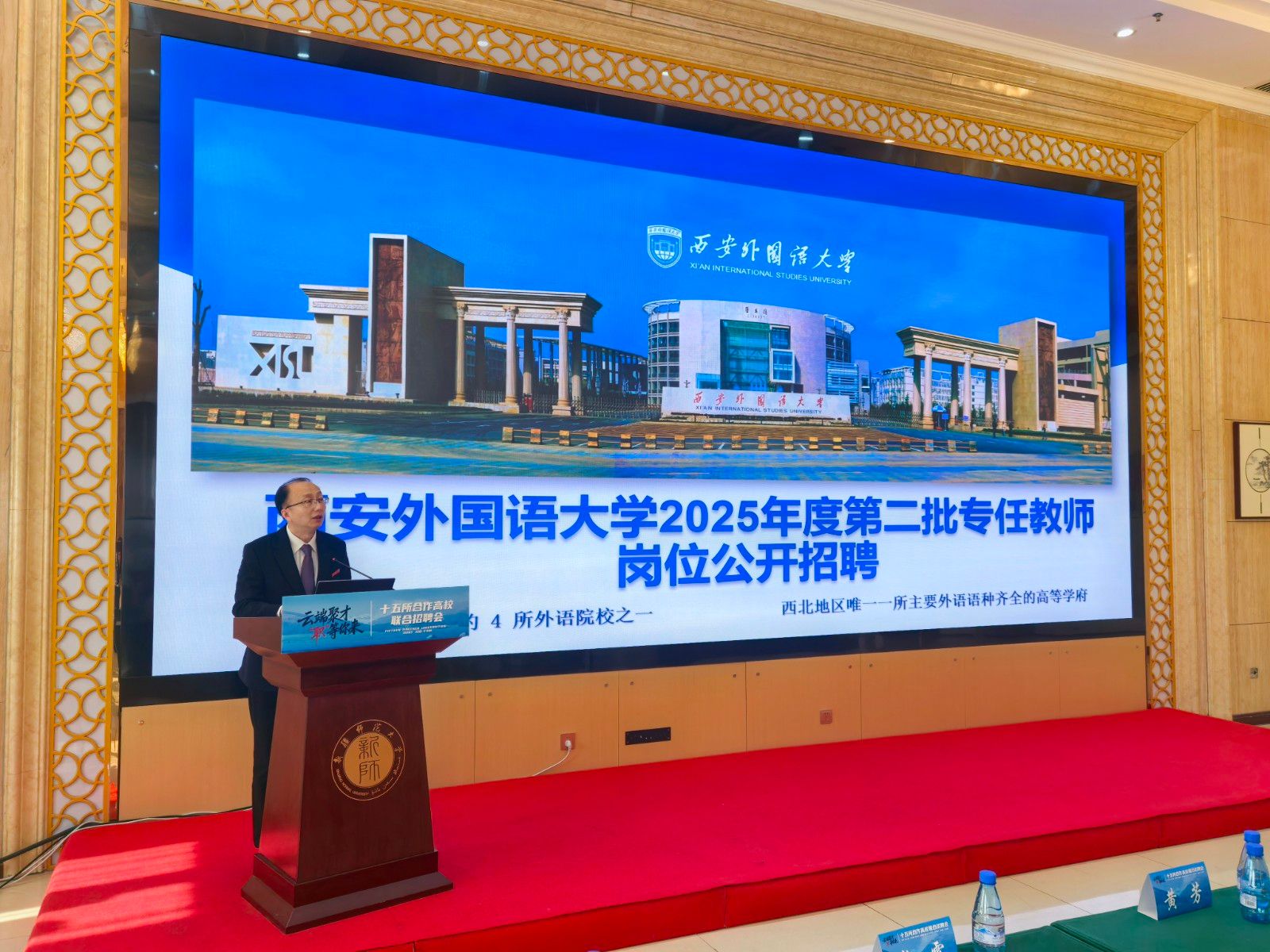 当天下午,黄立波代表学校参加了由中国科学技术大学、新疆师范大学联合举办的“云端聚才‘职’等你来——2025年对口支援合作高校联合招聘会”,通过现场宣讲+线上同步直播方式,向线上线下与会人员介绍了我校2025年度第二批专任教师招聘计划。