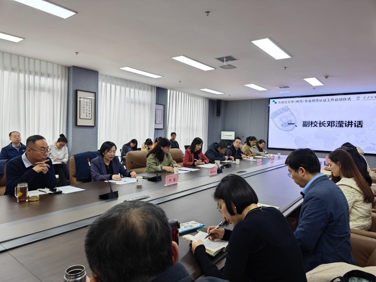 会上,邓滢在讲话中明确了师范专业认证工作的战略意义,介绍了我校师范专业建设和认证工作推进情况,强调指出师范认证即是对人才培养质量的检验,也是学校以评促建的重要契机。希望中国语言文学学院深刻认识师范认证工作的重要性,主动承担文化传承使命,精心组织认证工作,准确把握认证内涵与要求,扎实做好汉语言文学(师范)专业认证筹备工作,为学校人才培养高质量发展和全国特别是西部地区中小学优质师资培养贡献力量。
