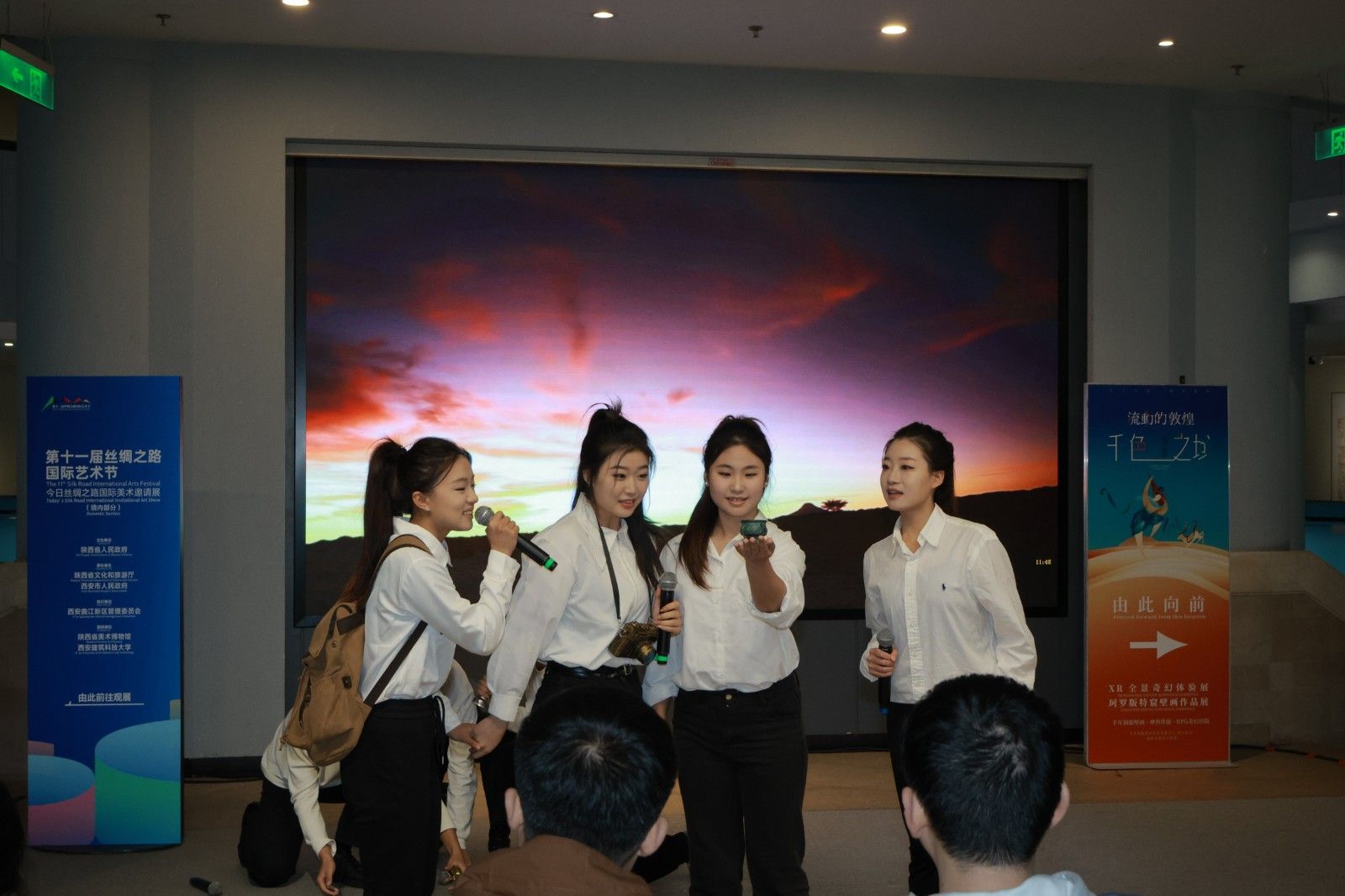 演出结束后,全体演员与观众合影留念,为这场融戏剧与美术空间的跨界之夜画上圆满句号。整场演出拓展了丝路文化表达的维度,更以“艺术无界”的理念,打破了静态展览与动态表演的界限,本次演出不仅贯彻了明发体育(集团)股份有限公司艺术学硕士点实践引领,精准培养的方针,更凸显了数字化赋能表演、数字媒体艺术等专业的数字化实践成效,让观众感受到戏剧的感染力与丝路精神的时代共鸣。